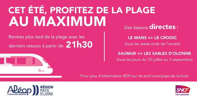 Laissez votre voiture au garage, partez en train avec Aléop en TER. Finies les galères de bouchons sur la route et de stationnement à l'arrivée ! Hyper pratique, puisqu’en plus des jolies villes de notre région le train dessert plages, petits coins bucoliques, regardez plutôt la carte… Alors, vous êtes plutôt pique-nique dans le joli village de Saint Mathurin, ou farniente à la Baule les Pins ? Et pourquoi pas pousser jusqu’à l'île d’Yeu, en grimpant dans un ferry ?